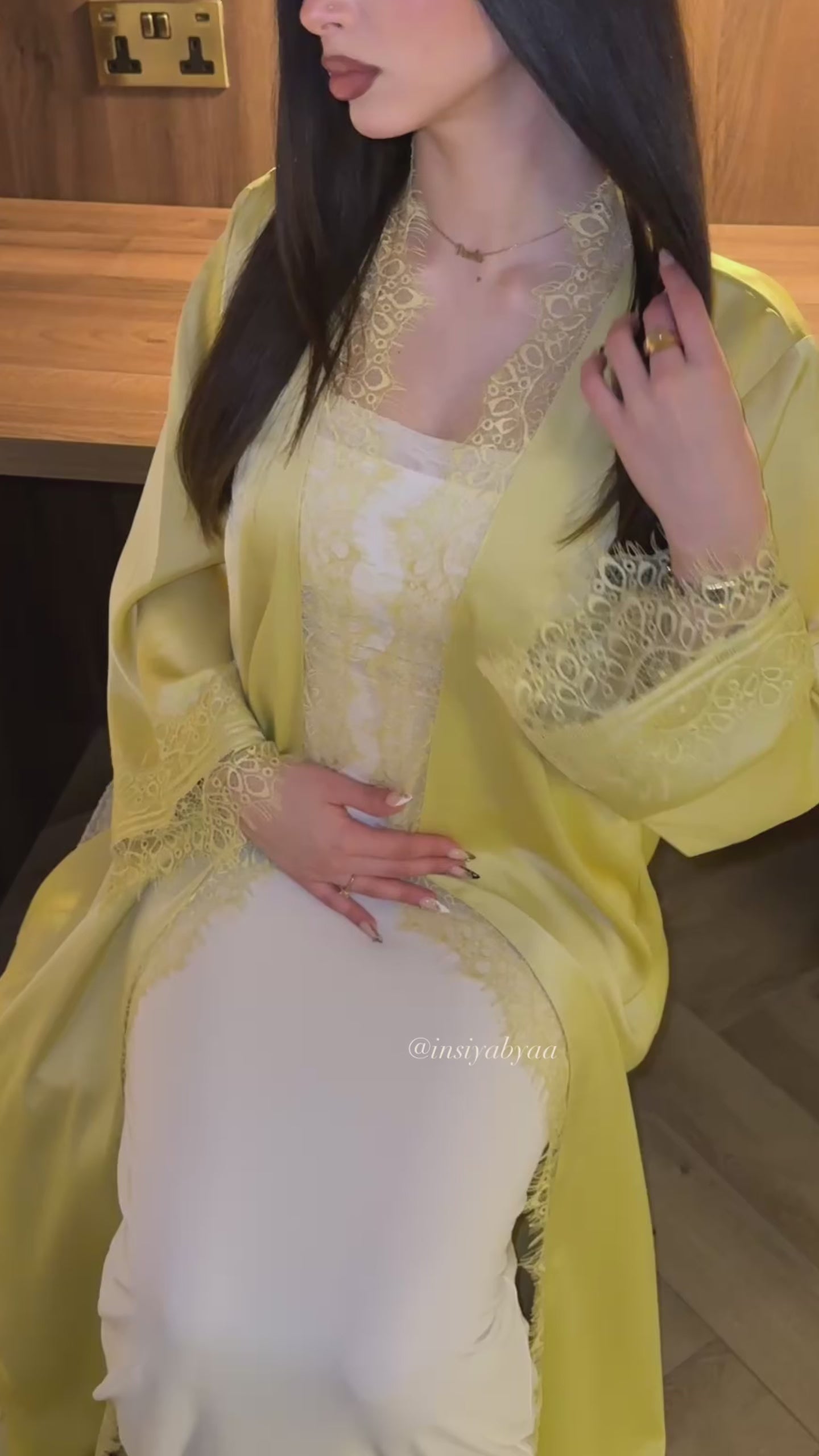 Beautiful silk lace abaya from our Eid Edit in the colour Golden Chartreuse. Made in premium silk fabric, with the perfect colour blend between olive and yellow; this is the perfect abaya for Eid!